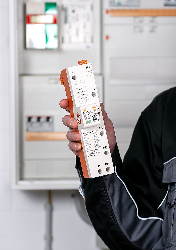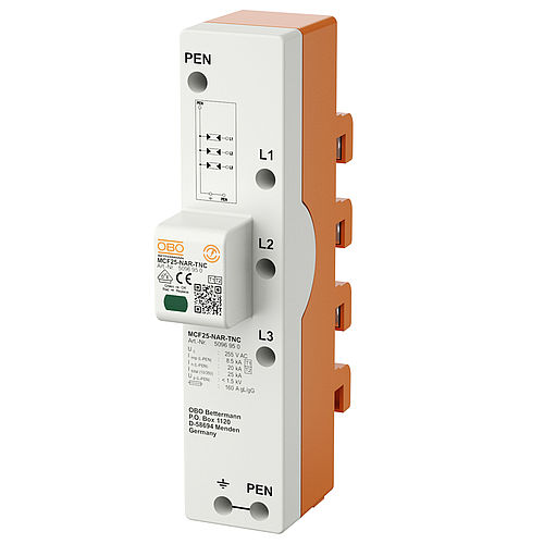 The combination arrestor MCF-NAR, type 1+2, is the newest member of the OBO Bettermann team against surge voltages. The name suffix NAR stands for "netzseitiger Anschlussraum" (power-side connection compartment), because the installed spark gap technology qualifies the surge protection device (SPD = Surge Protection Device) for use in the pre-meter area according to VDE-AR-N 4100.