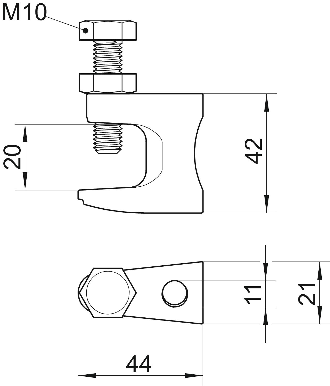 Breaking load 2,5 kN Connection type/component Hole Dimension 0-19mm Dimension B 21 mm Dimension D 11 mm Dimension F 20 mm Dimension G (mm) M10 Dimension H 42 mm Dimension L 44 mm Fastening hole 11 mm Fastening type Bolts Flange thickness F max. 20 mm Height 42 mm Hinge, adjustable no Hinged no Length 44 mm Material Cast iron Max. Tightening torque 18 Nm Thread M10 Thread metric 10 Width 21 mm - All types