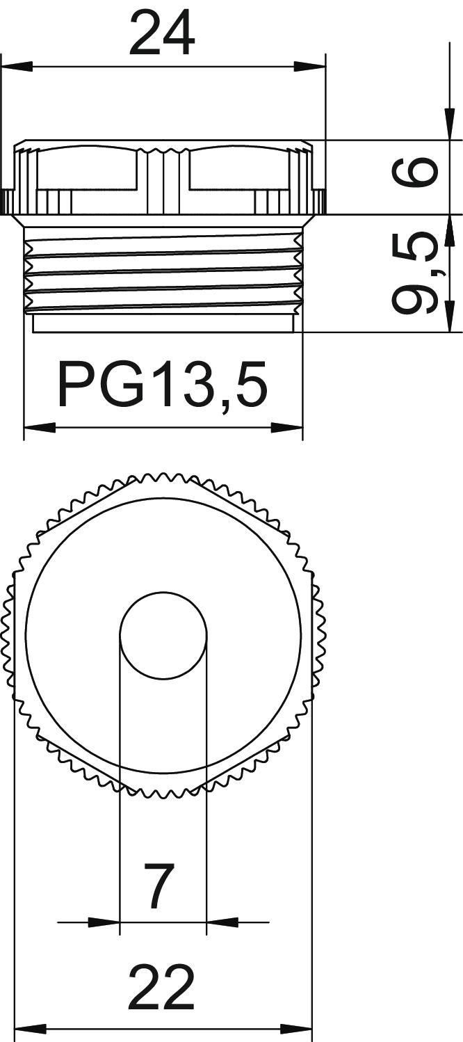 CO2 Footprint (GWP) Cradle-to-Gate 0,0065 kg CO2e / 1 Piece Colour Light grey; RAL 7035 Dimension PG13,5 Dimension D 7 mm Dimension E 24 mm Dimension L1 9,5 mm Dimension L2 6 mm Halogen-free yes Material Polyethylene Protection rating IP54 Size Pg 13,5 Thread length 9,5 mm WAF 22 - All types