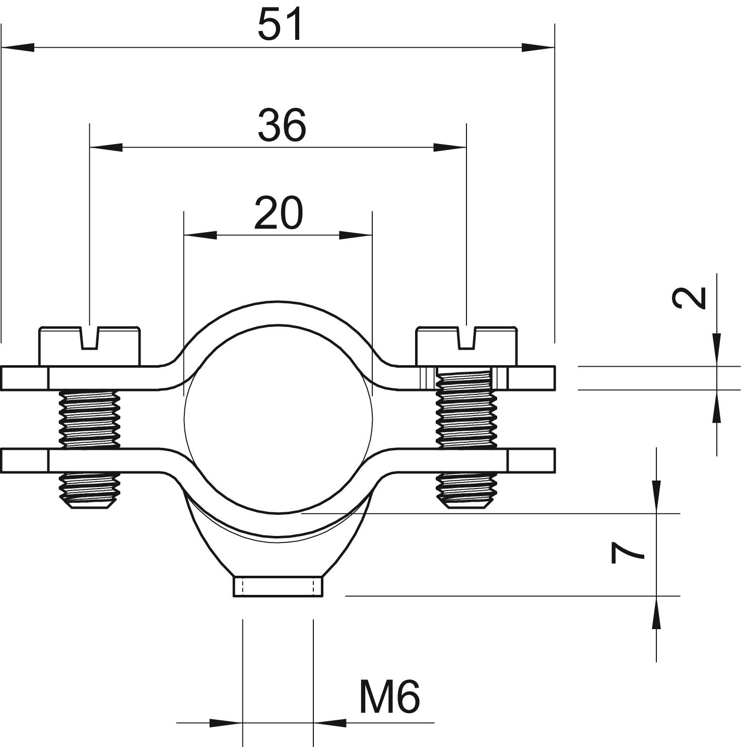 Bolt M5 x 14 Clamping range D, max. 20 mm Clamping range D, min. 16 mm CO2 Footprint (GWP) Cradle-to-Gate 0,074 kg CO2e / 1 Piece Dimension 16-20mm Dimension A 51 mm Dimension B 36 mm Dimension D 20 mm Dimension d min. 20 mm Dimension t 2 mm Fastening type Screw hole Halogen-free no Hole size M6 mm Length 51 mm Material Steel Material thickness 2 mm Number of cables/pipes 1 Plastic-covered no Suitable in fire protection area no Surface Electrogalvanized UV-resistant yes Version for Closed - All types
