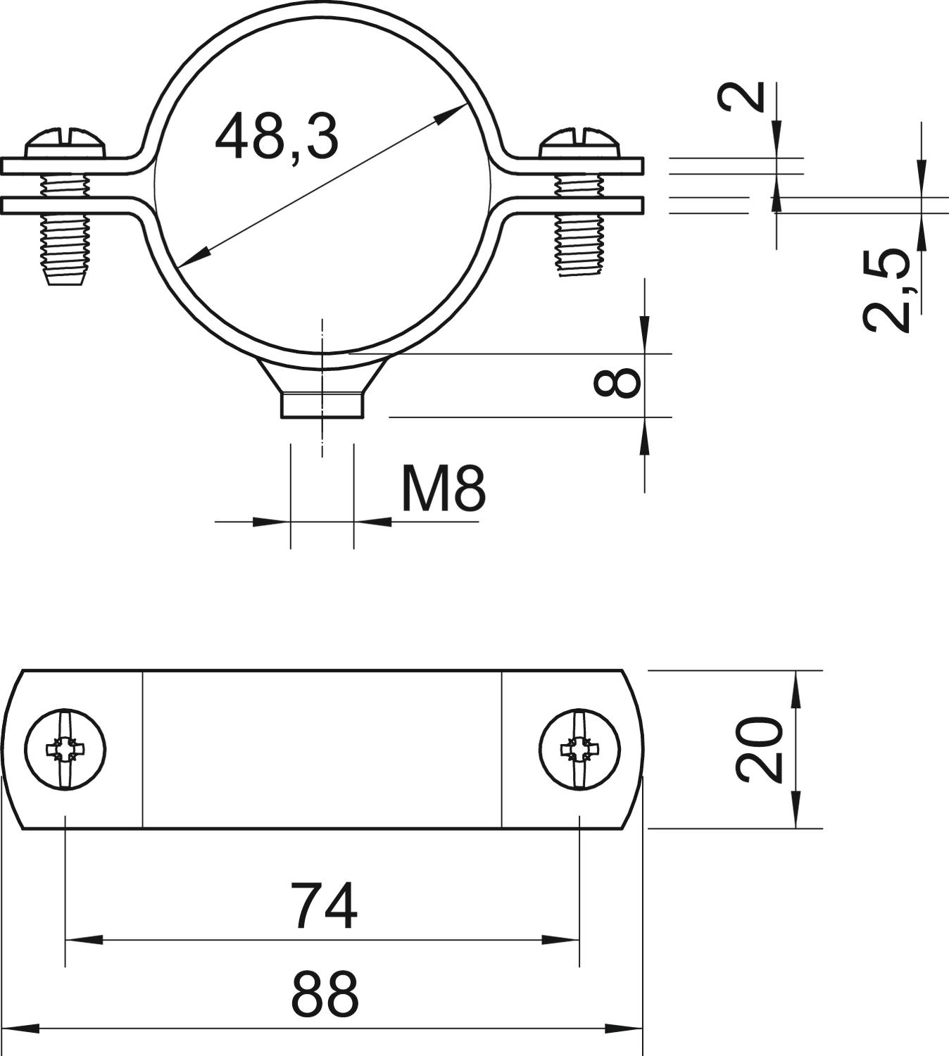 Bolt M6 x 18 Clamping range D, max. 48,5 mm Clamping range D, min. 45,5 mm CO2 Footprint (GWP) Cradle-to-Gate 0,2015 kg CO2e / 1 Piece Dimension 1 1/2" Dimension A 88 mm Dimension B 74 mm Dimension D 48,3 mm Dimension d min. 48,3 mm Dimension t 2 mm Dimension t1 (mm) 2,5 Dimension x 3 mm Fastening type Screw hole For diameter 48,5 for pipe diameter M50 Halogen-free no Hole size M8 mm Length 88 mm Material Steel Material thickness 2,5 mm Plastic-covered no Size 1 1/2" Suitable in fire protection area no Surface Hot-dip galvanised Thread M8 UV-resistant yes Version for Closed Width 20 mm - All types
