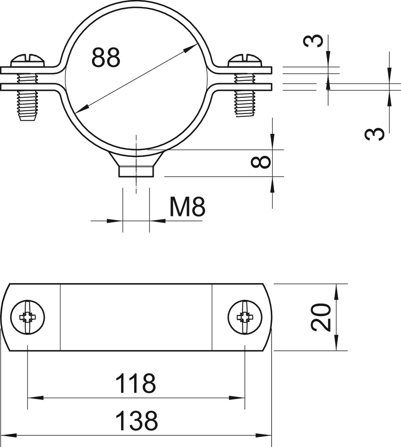 Bolt M6 x 18 Clamping range D, max. 88 mm Clamping range D, min. 83 mm CO2 Footprint (GWP) Cradle-to-Gate 0,4973 kg CO2e / 1 Piece Dimension 3" Dimension A 138 mm Dimension B 118 mm Dimension D 88 mm Dimension d min. 88 mm Dimension t 3 mm Dimension t1 (mm) 3 Dimension x 5 mm Fastening type Screw hole For diameter 88 for pipe diameter M95 Halogen-free no Hole size M8 mm Length 138 mm Material Steel Material thickness 3 mm Plastic-covered no Size 3" Suitable in fire protection area no Surface Hot-dip galvanised Thread M8 UV-resistant yes Version for Closed Width 20 mm - All types