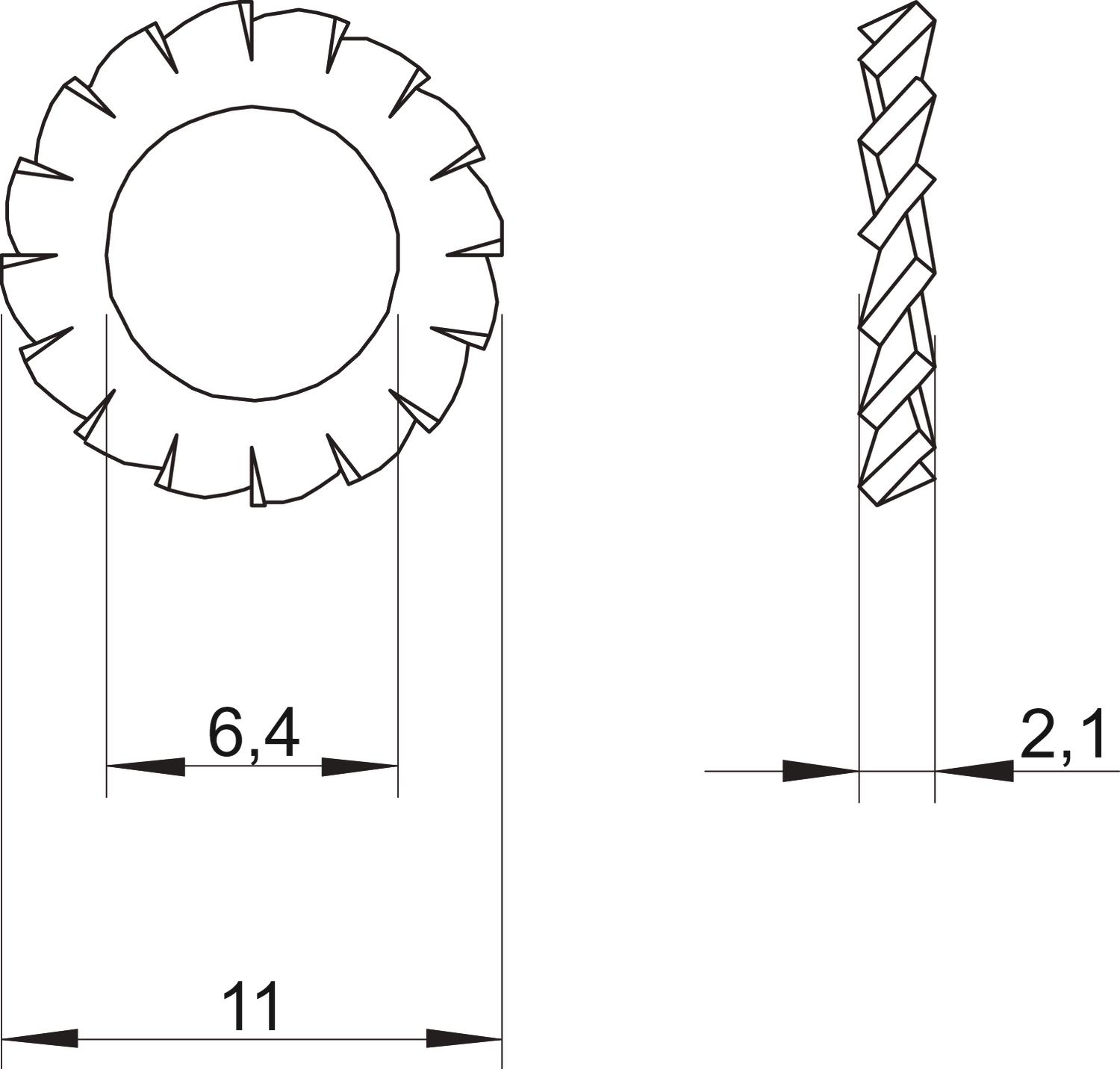 CO2 Footprint (GWP) Cradle-to-Gate 0,0041 kg CO2e / 1 Piece Dimension M6 Dimension d 6,4 mm Dimension d max. 11 mm Dimension d min. 11 mm Dimension h 2,1 mm External diameter 11 mm Height 2,1 mm Lock washer version Open external gearing Material Stainless steel Surface Bright, treated Thickness 2,1 mm Thread M6 - All types