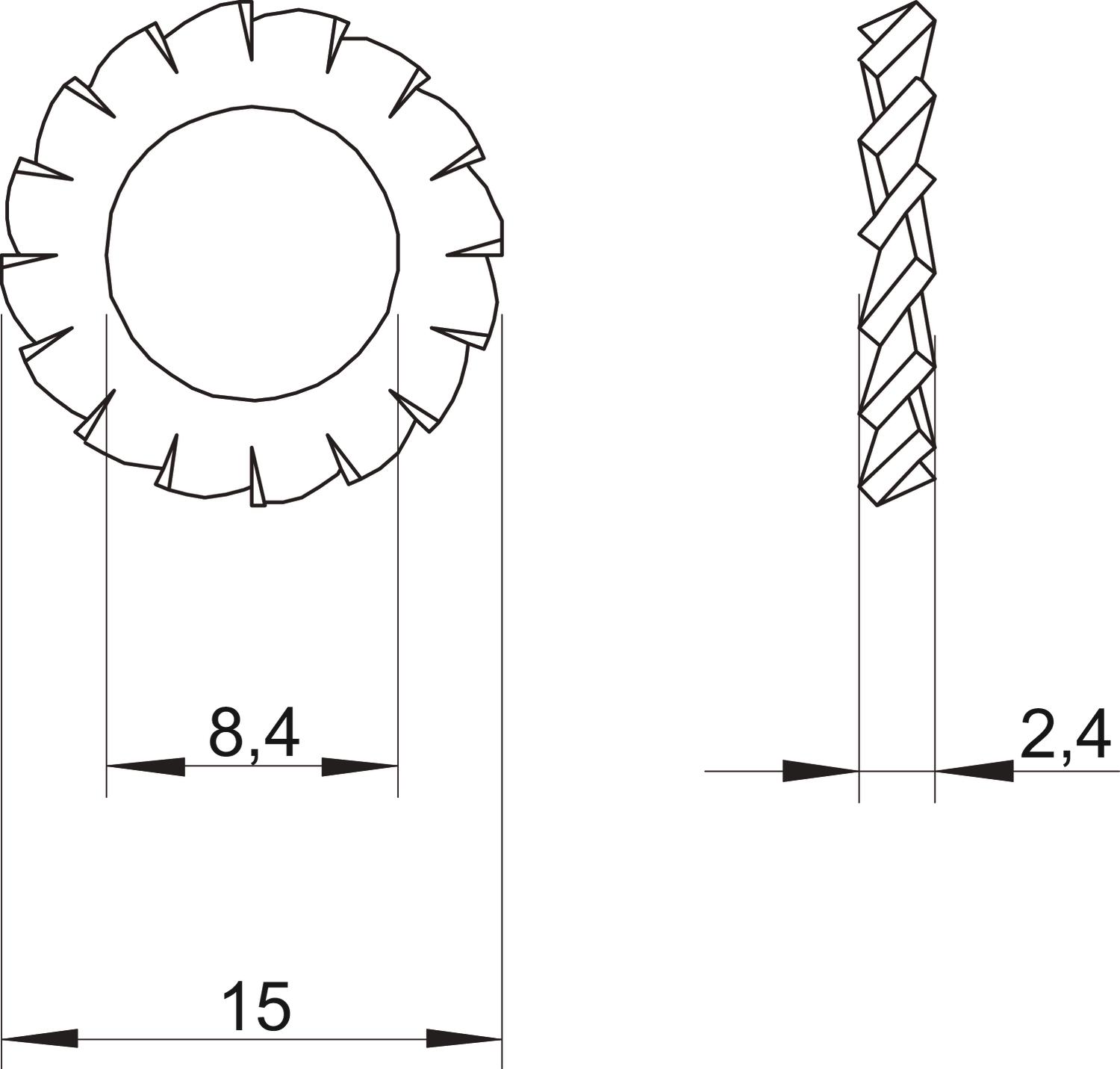 CO2 Footprint (GWP) Cradle-to-Gate 0,0041 kg CO2e / 1 Piece Dimension M8 Dimension d 8,4 mm Dimension d max. 15 mm Dimension d min. 15 mm Dimension h 2,4 mm External diameter 15 mm Height 2,4 mm Lock washer version Open external gearing Material Stainless steel Surface Bright, treated Thickness 2,4 mm Thread M8 - All types