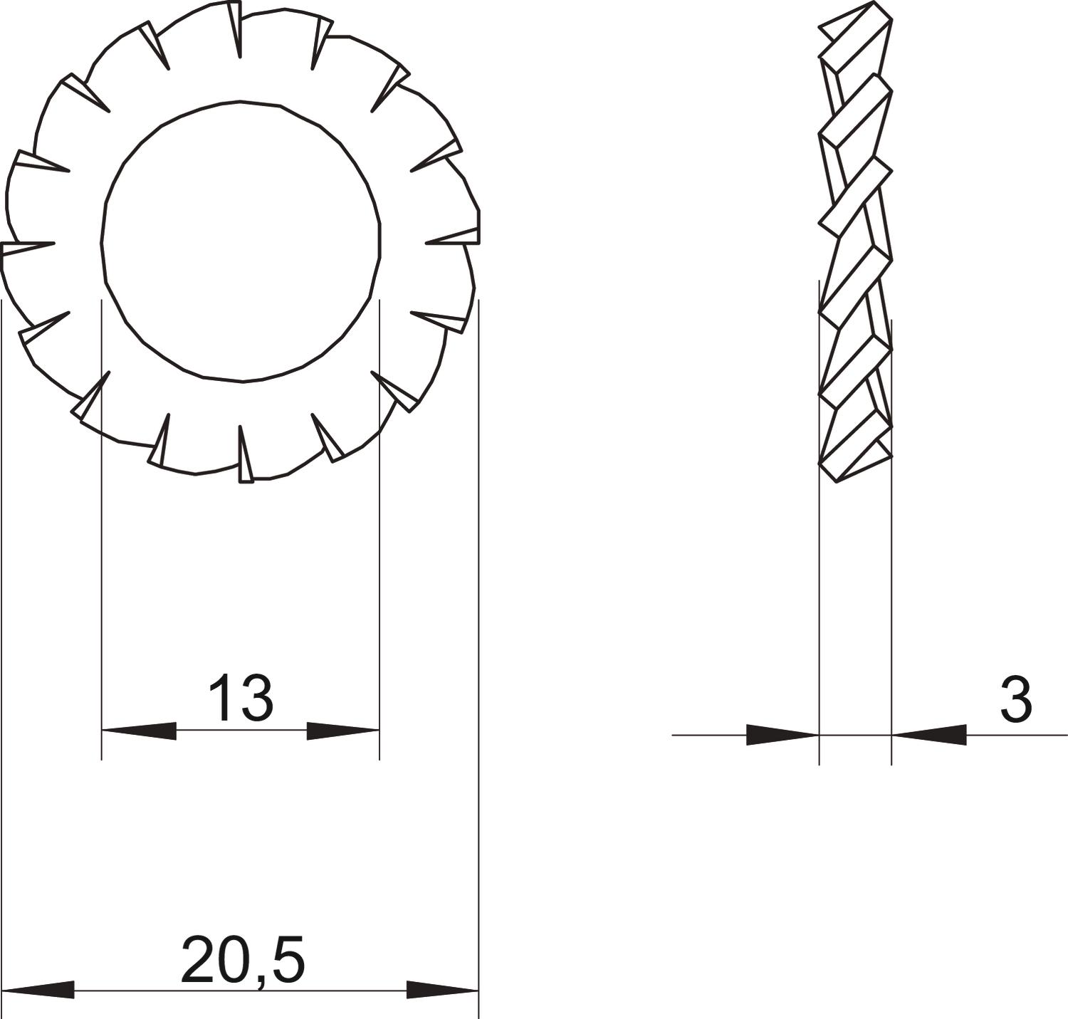 CO2 Footprint (GWP) Cradle-to-Gate 0,008 kg CO2e / 1 Piece Dimension M12 Dimension d 13 mm Dimension d max. 20,5 mm Dimension d min. 20,5 mm Dimension h 3 mm External diameter 20,5 mm Height 3 mm Lock washer version Open external gearing Material Stainless steel Surface Bright, treated Thickness 3 mm Thread M12 - All types