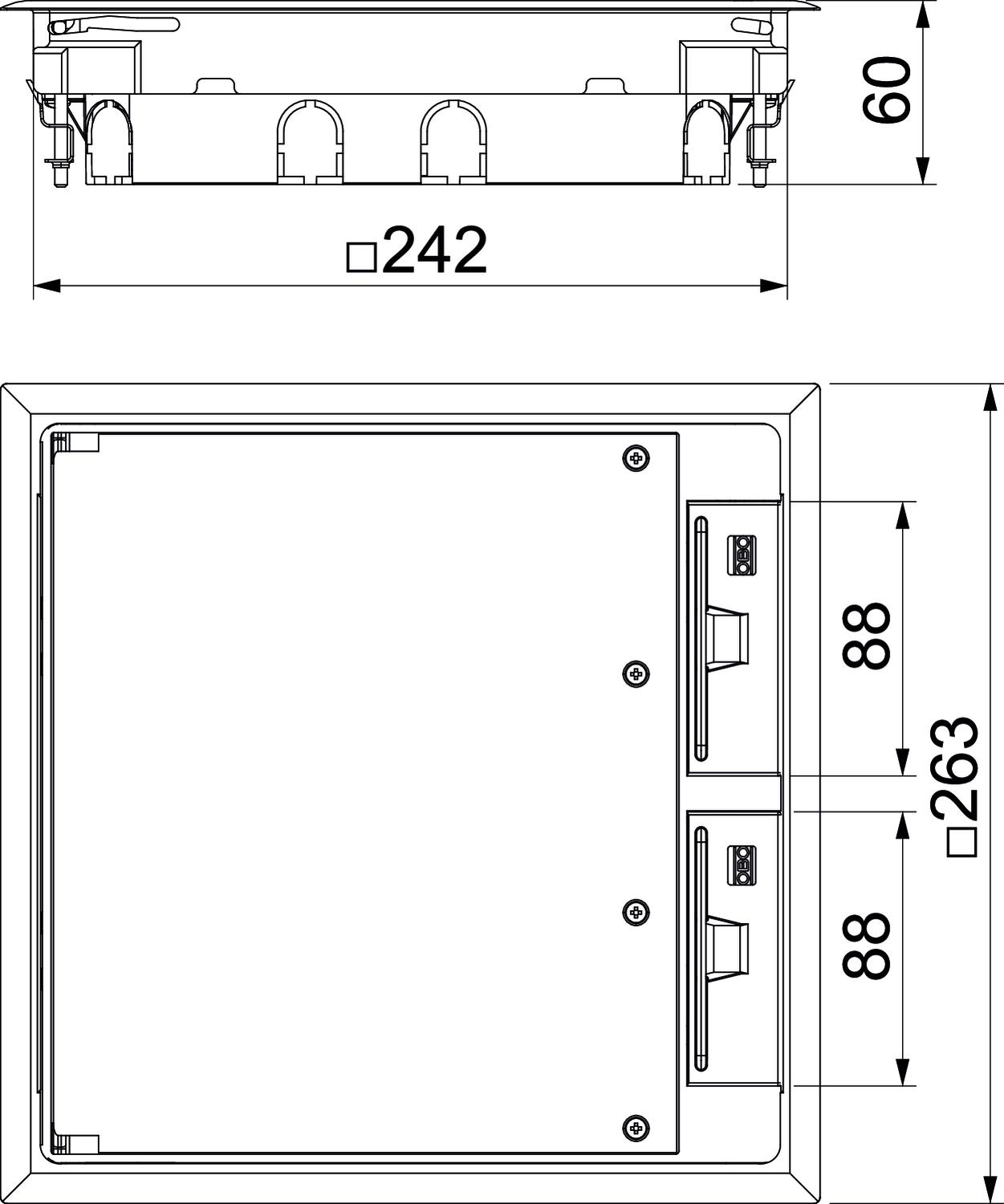Cable outlet version Swivellable cord outlet Clamping range D, max. 31 mm Clamping range D, min. 9 mm CO2 Footprint (GWP) Cradle-to-Gate 6,3617 kg CO2e / 1 Piece Colour Iron grey; RAL 7011 Device support to accept mounting boxes no Dimension 263x263x59 Dimension h 55 mm Floor care Dry Floor covering protection frame yes Floor covering thickness 5 mm Floor height, min. 58 mm Frame version Carpet protection frame Heavy-duty version no Height 59 mm Installation depth 58 mm Length 263 mm Length of external dimensions 263 mm Length of installation dimensions 242 mm Material Polyamide Nominal size for device installation units 9 Number of installable devices 8 Opening mechanism Handle Screed height, min. 55 mm Seal installation option no Suitable for cavity floor installation yes Suitable for raised floor installation yes Suitable for screed-covered underfloor ducts yes Suitable for screed-flush closed underfloor ducts yes Suitable for underfloor ducts yes Suitable for wet care no Version for Square Vertical load, large area to 5,000 N Vertical load, small area to 3,000 N Wide external dimensions 263 mm Wide installation dimensions 242 mm Width 263 mm With floor covering recess no - All types