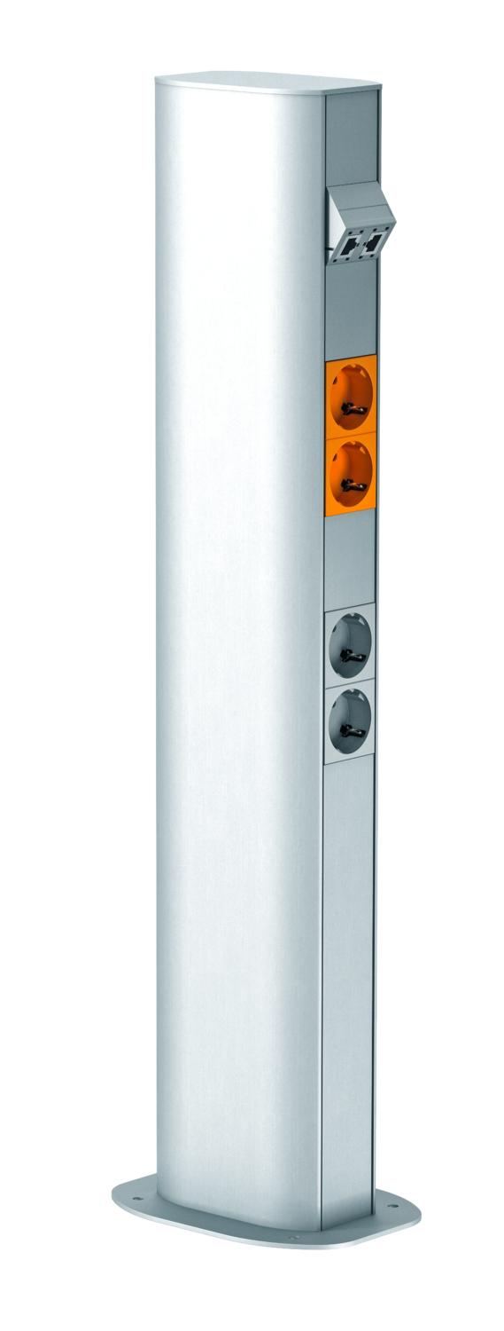 The design of this service pole is based on an extremely slender, oval aluminium profile, which shows a cover of the Rapid 45 device installation trunking series at both narrow ends of the oval. The 45 mm system opening is suitable for direct acceptance of Modul 45® switching and connection devices. The installation area is theoretically sufficient for 2x 14 Modul 45® devices. If Modul 45connect® is used or in the case of cabling requiring a lot of space, the number of the max. installable devices is reduced. There is the option of installing a partition, type 2371/40 (6023096).