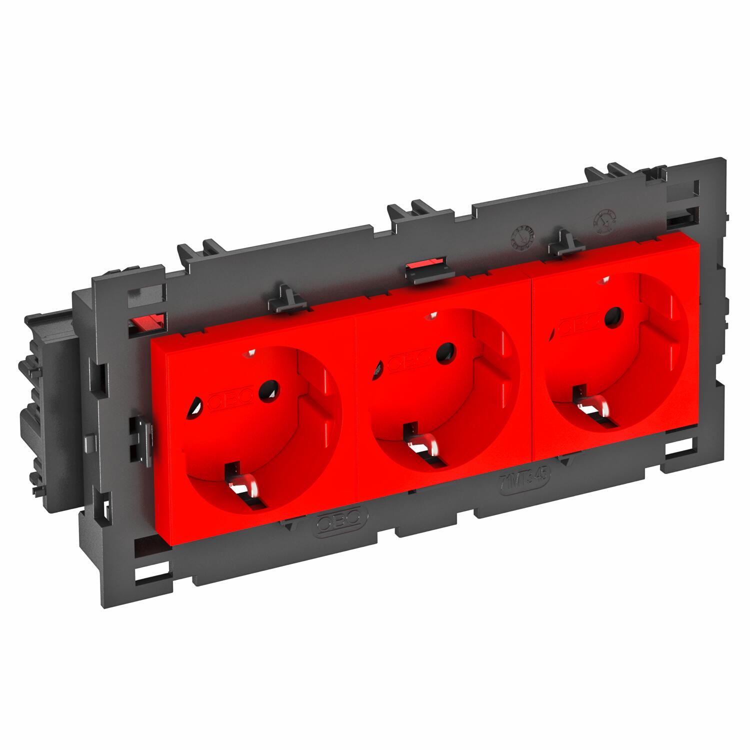 Product descriptionProtective contact socket with connection to side, triple 0°, with increased touch protection, with screwless terminals, 2-pin, 16 A, 250 V~, with connection terminals to IEC 60884-1, suitable for the installation in Rapid 80 device installation trunking systems.