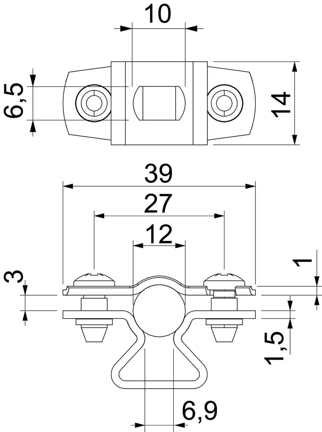 Clamping range D, max. 12 mm Clamping range D, min. 10 mm CO2 Footprint (GWP) Cradle-to-Gate 0,0609 kg CO2e / 1 Piece Dimension 10-12mm Dimension A 39 mm Dimension b 14 mm Dimension B 27 mm Dimension D 12 mm Dimension d max. 12 mm Dimension d min. 10 mm Dimension L 10 mm Dimension s 6,9 mm Dimension t1 (mm) 1 Dimension t2 (mm) 1,5 Dimension x 3 mm Distance to the wall yes Fastening type Screw hole For diameter 10 - 12 Halogen-free yes Maintain electrical functions yes Material Steel Material thickness 1,5 mm Number of cables/pipes 1 Plastic-covered no Surface Hot-dip galvanised UV-resistant yes Version for Closed - All types