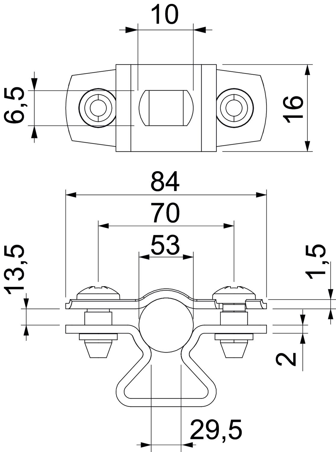 Clamping range D, max. 53 mm Clamping range D, min. 44 mm CO2 Footprint (GWP) Cradle-to-Gate 0,1781 kg CO2e / 1 Piece Dimension 44-53mm Dimension A 84 mm Dimension B 70 mm Dimension b 16 mm Dimension D 53 mm Dimension d max. 53 mm Dimension d min. 44 mm Dimension L 10 mm Dimension s 29,5 mm Dimension t1 (mm) 1,5 Dimension t2 (mm) 2 Dimension x 13,5 mm Distance to the wall yes Fastening type Screw hole For diameter 44 - 53 Halogen-free yes Maintain electrical functions yes Material Steel Material thickness 1,5 mm Number of cables/pipes 1 Plastic-covered no Surface Hot-dip galvanised UV-resistant yes Version for Closed - All types