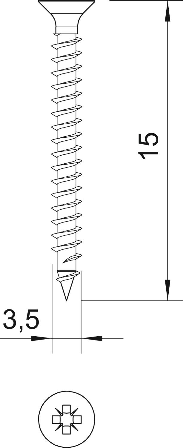 Dimension 3,5x15mm Dimension D 3,5 mm Dimension L 15 mm Hardened yes Head diameter 6,5 mm Head shape Countersunk head Length 15 mm Material Steel Screw system Pozidrive PZ Surface Electrogalvanized - All types
