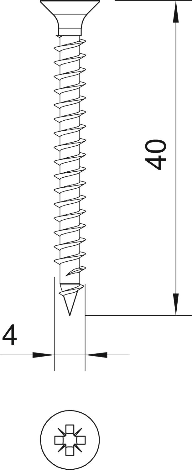 Dimension 4x40mm Dimension D 4 mm Dimension L 40 mm Hardened yes Head diameter 7,5 mm Head shape Countersunk head Length 40 mm Material Steel Screw system Pozidrive PZ Surface Electrogalvanized - All types