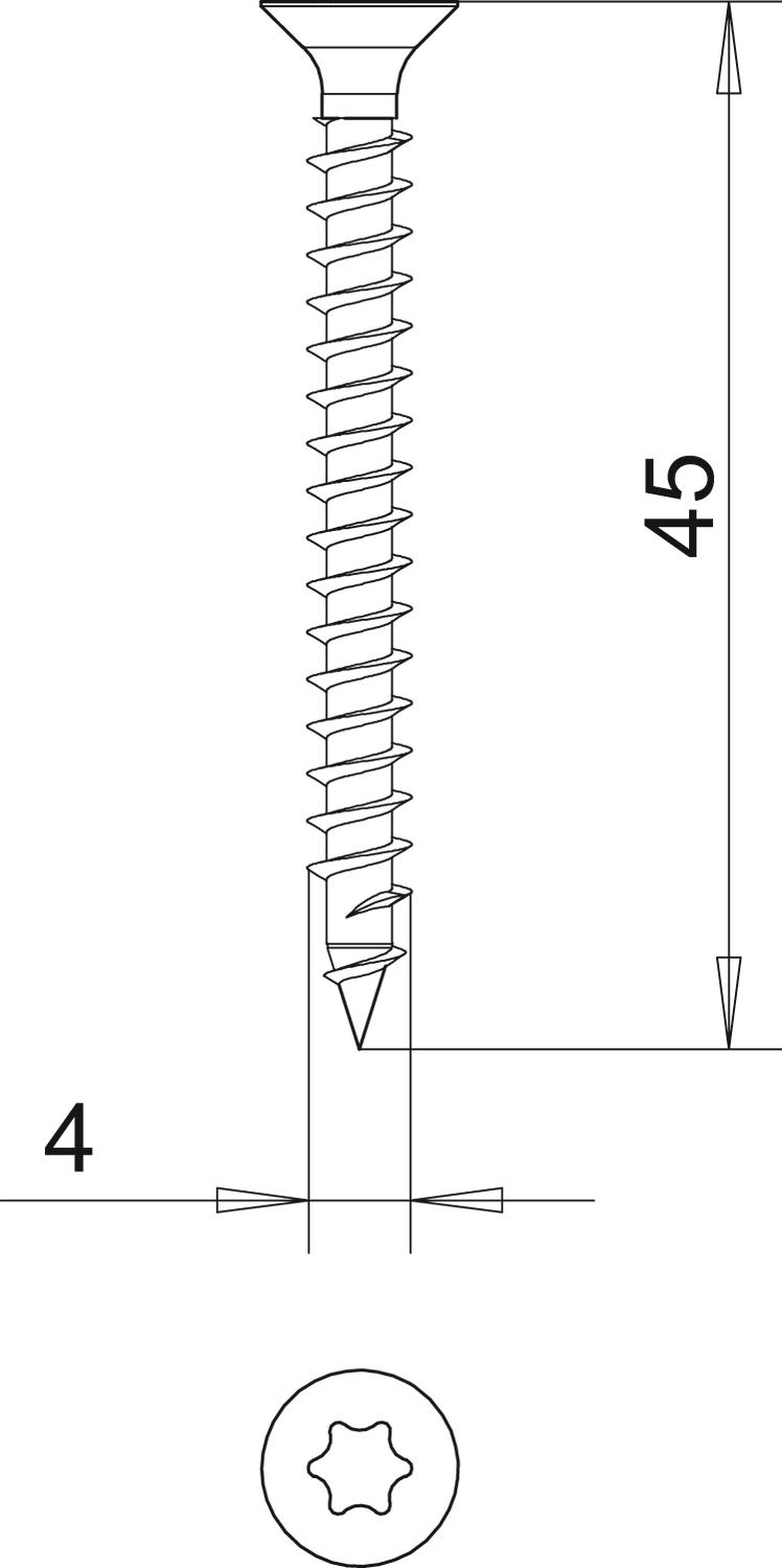 Dimension 4x45mm Dimension D 4 mm Dimension L 45 mm Hardened yes Head diameter 7,5 mm Head shape Countersunk head Length 45 mm Material Steel Screw system Torx Surface Electrogalvanized - All types