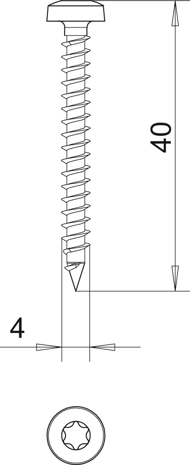 Dimension 4x40mm Dimension D 4 mm Dimension L 40 mm Hardened yes Head diameter 7,5 mm Head shape Panhead Length 40 mm Material Steel Screw system Torx Surface Electrogalvanized Thickness 4 mm Two-compartment yes - All types