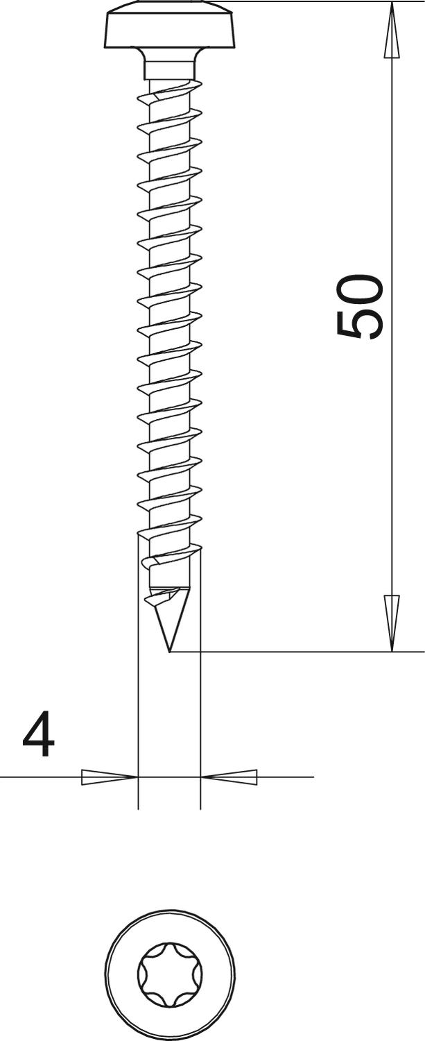 Dimension 4x50mm Dimension D 4 mm Dimension L 50 mm Hardened yes Head diameter 7,5 mm Head shape Panhead Length 50 mm Material Steel Screw system Torx Surface Electrogalvanized Thickness 4 mm Two-compartment yes - All types