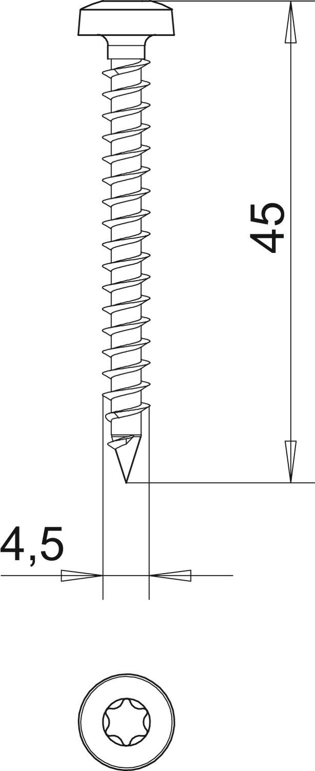 Dimension 4,5x45mm Dimension D 4,5 mm Dimension L 45 mm Hardened yes Head diameter 8,2 mm Head shape Panhead Length 45 mm Material Steel Screw system Torx Surface Electrogalvanized Thickness 4,5 mm Two-compartment yes - All types