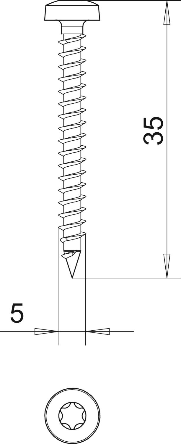 Dimension 5x35mm Dimension D 5 mm Dimension L 35 mm Hardened yes Head diameter 9,5 mm Head shape Panhead Length 35 mm Material Steel Screw system Torx Surface Electrogalvanized Thickness 5 mm Two-compartment yes - All types