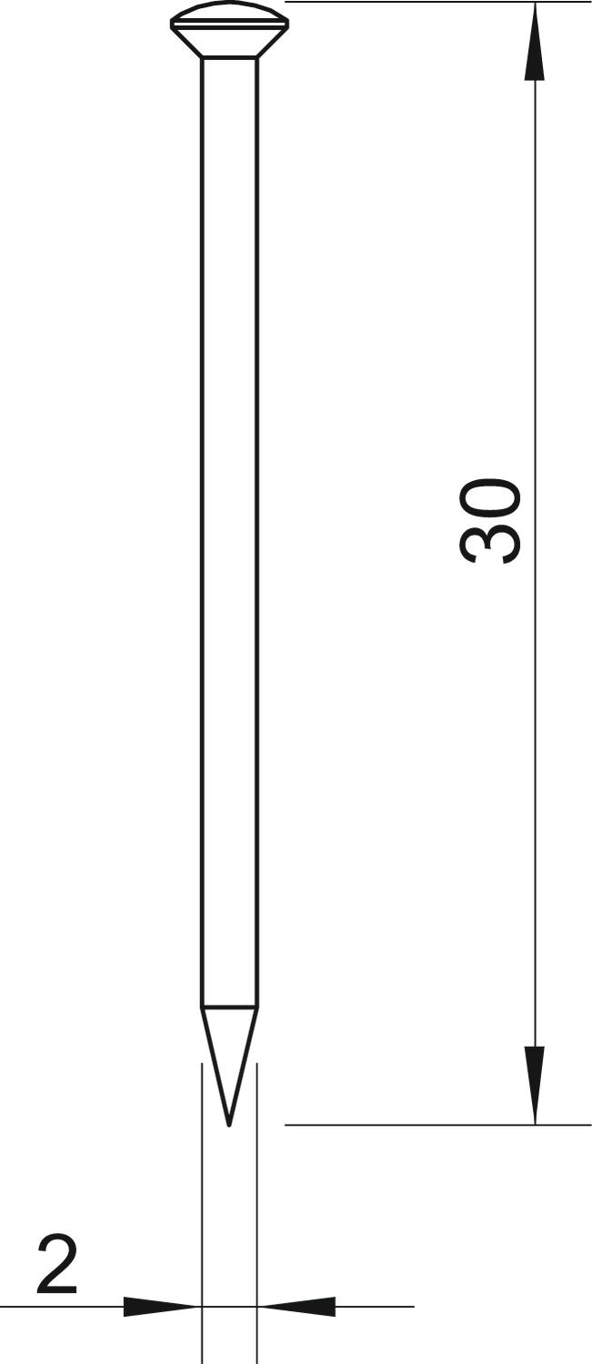 Dimension 2x30mm Dimension d 2 mm Dimension L 30 mm Hardened yes Head shape Rounded head Length 30 mm Material Steel Screw nail version no Shank diameter 2 mm Surface Electrogalvanized Version for Nail - All types