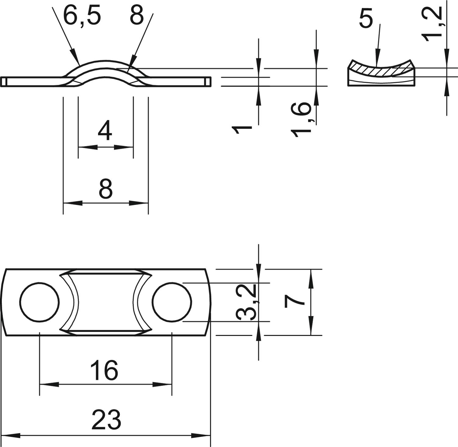 Clamping range D, max. 6,5 mm Clamping range D, min. 6,5 mm CO2 Footprint (GWP) Cradle-to-Gate 0,0031 kg CO2e / 1 Piece Dimension 6,5mm Dimension (mm) 8 mm Dimension a1 (mm) 8 mm Dimension a2 4 mm Dimension b 7 mm Dimension d 3,2 mm Dimension h 1,6 mm Dimension H1 (mm) 1,2 Dimension L 23 mm Dimension l 16 mm Dimension R 6,5 mm Dimension r1 (mm) 5 Dimension t 1 mm Distance to the wall no Fastening type Screw hole For diameter 6,5 Halogen-free yes Height 1,6 mm Hole size 3,2 mm Length 23 mm Material Steel Material thickness 1 mm Nominal diameter 6,5 mm Number of cables/pipes 1 Plastic-covered no Size II Suitable in fire protection area no Surface Electrogalvanized UV-resistant yes Version for Two-lobe Width 7 mm - All types