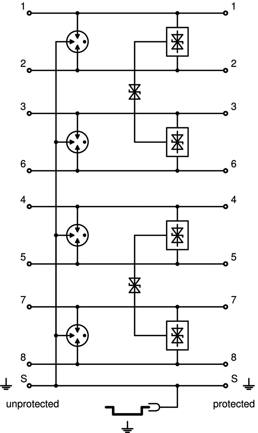 Channel performance Ansi/EA CAT 6 Channel performance ISO/IEC Class E CO2 Footprint (GWP) Cradle-to-Gate 1,4746 kg CO2e / 1 Piece Colour Silver grey; RAL 7001 Dimension 58V Earthing via: Connection cable / DIN rail Explosion-tested version no Impulse durability wire-earth C2: 3 kV / 1,5 kA (8/20µs) Impulse durability wire-wire C1: 0,3 kV / 0,15 kA (8/20µs) Insertion loss ≤3 dB Kategorie Type 2+3 / C2+C1 Lightning protection zone LPZ 1→3 Material Aluminium Maximum continuous voltage AC 41 V Maximum continuous voltage DC 58 V Number of poles 8 Permitted temperature range, max. 80 °C Permitted temperature range, min. -40 °C Plug-in system RJ45 8(8) Protection level wire-earth <900 V Protection level wire-wire <40 V Protection rating IP20 Screening Direct Shielding connection available yes SPD to IEC 61643-21 Class II+III / C2+C1 Telecommunications contact no Testing standard IEC 61643-21 Total discharge current (8/20) 5 kA Version for Fine protection, 8 wires + shield - All types
