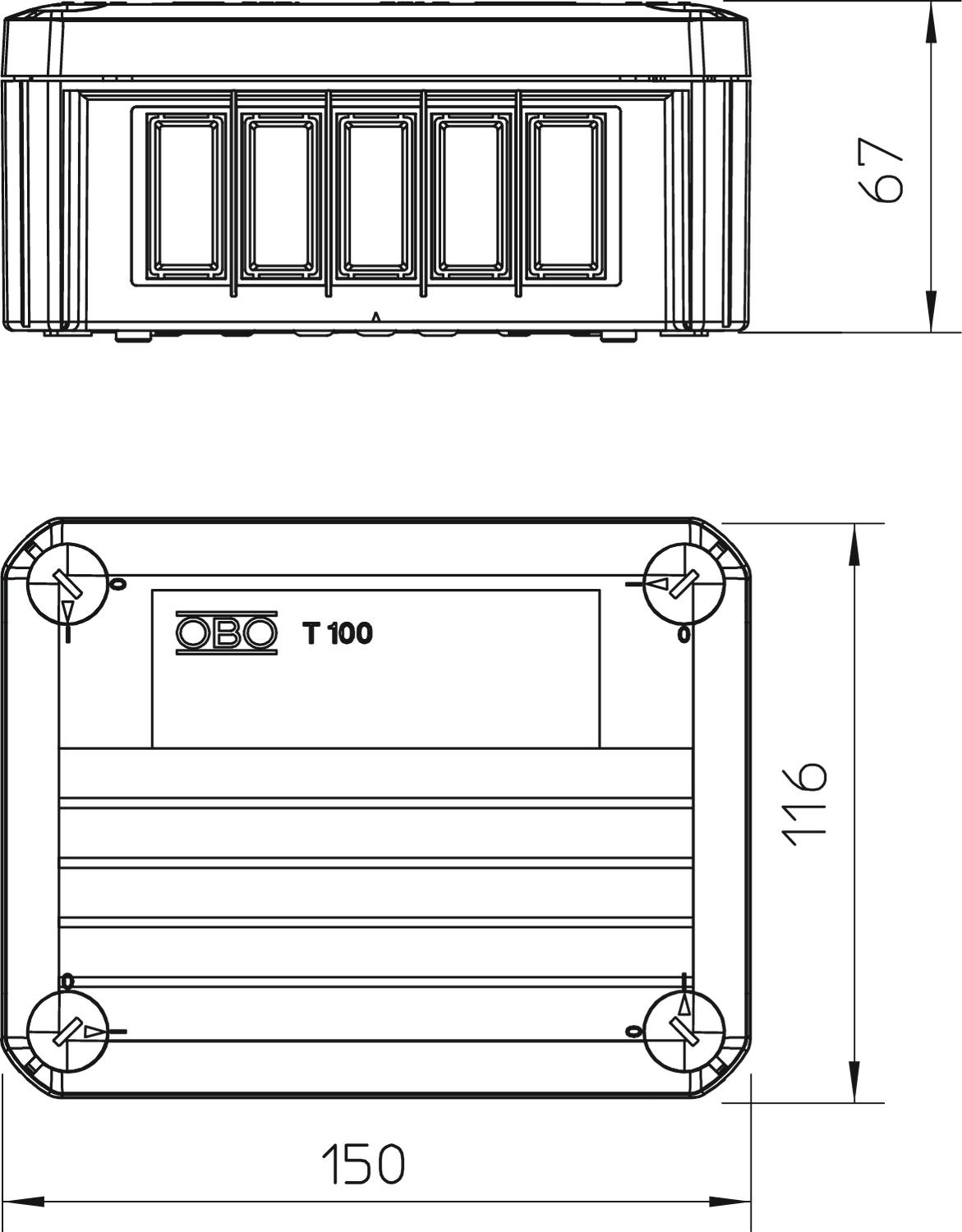 Clear internal dimensions 136x102x57 mm CO2 Footprint (GWP) Cradle-to-Gate 0,5784 kg CO2e / 1 Piece Colour Light grey; RAL 7035 Cover Not transparent Cover fastening Screwed Dimension 150x116x67 Entry from rear yes Equipment Miscellaneous Expandable yes Explosion-tested version no Flame-resistant acc. to VDE 0471/DIN 695 Part 2-1, test temperature 650°C For Ex zone Without For Ex zone dust Without For Ex zone gas Without Halogen-free yes Height 67 mm Length 150 mm Maintain electrical functions Without Material Polypropylene Measured insulation voltage Vi 500 V Mounting type Wall/ceiling mounting No. of entries 4 Nominal cross-section, min. 2,5 mm² Nominal voltage 500 V Permitted temperature range, max. 60 °C Permitted temperature range, min. -5 °C Protection rating IP20 Sealable yes Shape Rectangular Transparent lid no Type of entry Strain relief entries for direct penetrations for cable diameters of 7−21 mm Type of housing penetration Pre-marking Weatherproof no Width 116 mm with lid yes With screening no - All types