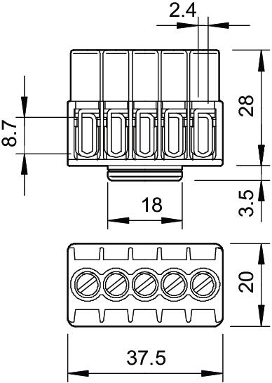 Closing plate required no CO2 Footprint (GWP) Cradle-to-Gate 0,0989 kg CO2e / 1 Piece Colour Light grey Connectable conductor cross-section, single-wire, max. 4 mm² Connectable conductor cross-section, single-wire, min. 1 mm² Connection position Side Cross-section Max. connectable cross-sections per terminal max. 4 x 2.5 mm², 5 x 1.5 mm² or 6 x 1 mm² mm² Dimension 4mm² Explosion-tested version no Height 28 mm Insulation material Thermoplast Length 37,5 mm Material Polyamide No. of terminals 5 Nominal cross-section, max. 4 mm² Nominal cross-section, min. 1 mm² Nominal current 32 A Nominal voltage 400 V Number of screwless terminals per pole 1 Pole number 5 Transparent no Version of electrical connection 1 Screw connection Width 20 mm - All types