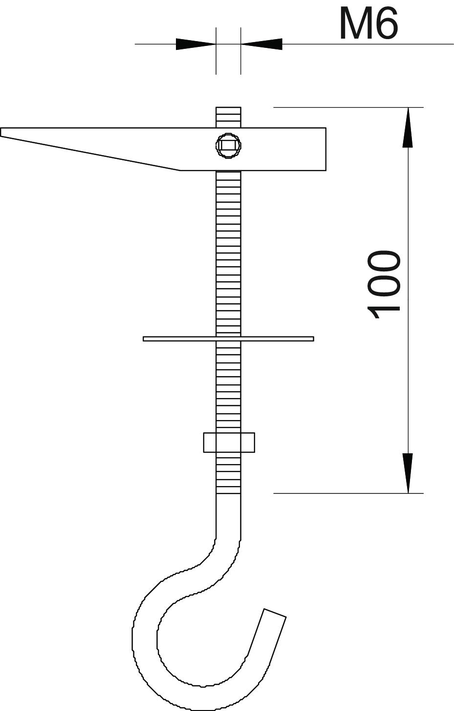 Breaking load 0,7 kN CO2 Footprint (GWP) Cradle-to-Gate 0,1446 kg CO2e / 1 Piece Dimension M6x100mm Dimension L 100 mm Drill hole 16 mm Drill hole diameter, min. 16 mm hook diameter 16 mm Length 100 mm Material Steel Surface Electrogalvanized Thread M6 Thread type Metric Version for With ceiling hook With washer yes - All types