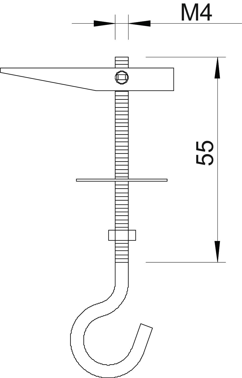 Breaking load 0,25 kN CO2 Footprint (GWP) Cradle-to-Gate 0,0786 kg CO2e / 1 Piece Dimension M4x55mm Dimension L 55 mm Drill hole 13 mm Drill hole diameter, min. 13 mm hook diameter 14 mm Length 55 mm Material Steel Surface Electrogalvanized Thread M4 Thread type Metric Version for With ceiling hook With washer yes - All types
