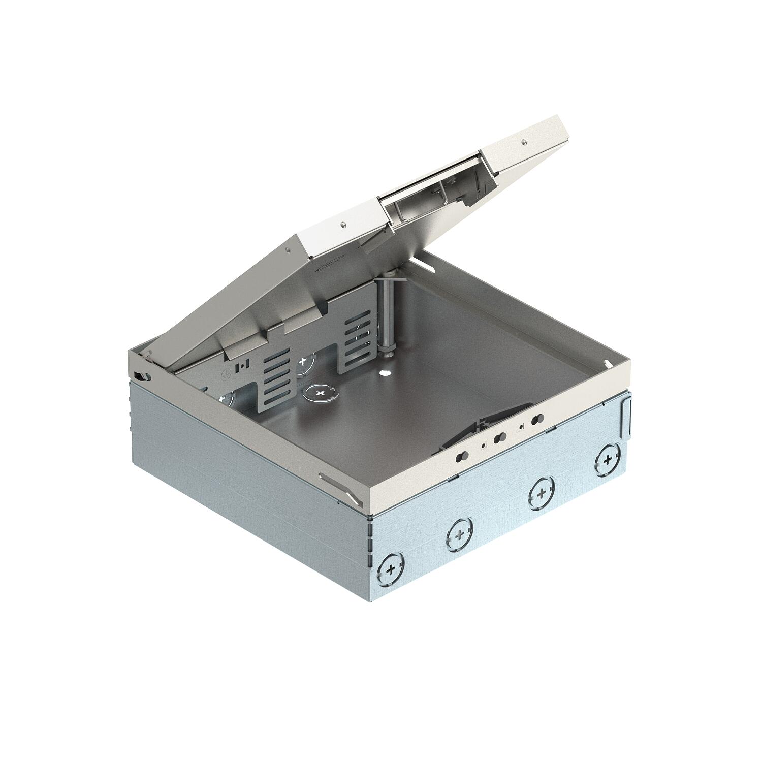 Product descriptionSquare floor box for use in dry-cleaned cavity and screed floors in indoor areas. Installation housing with pre-marked insertion openings for pipes (M25). Empty housing for up to three UT4 universal supports for up to 12 Modul 45 ® devices. Cover adjustable to top edge of floor covering using four height-adjustment supports. The minimum installation depth is 95 mm, the height-adjustment range + 30 mm.