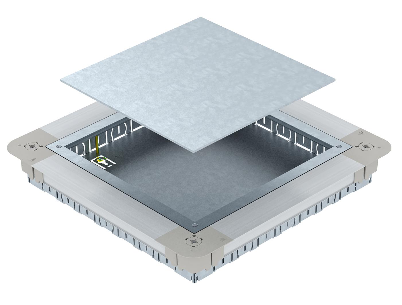 Product descriptionUnderfloor accessory box with mounting lid and lid blanking plate with sheet steel side walls. For the installation of a square GES9 55 service outlet in screed heights of 55 mm or more. Height can be infinitely adjusted to the nominal screed height and the screed can be worked flush to the screed scraping edge. With 7 x M20, 3 x M25, 4 x M32 pipe insertion openings on each side. Usable pipe size at a system height of 55 mm: M20.