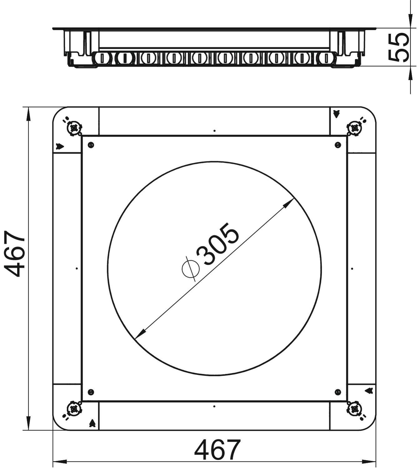Product descriptionUnderfloor accessory box with mounting lid and lid blanking plate with sheet steel side walls. For the installation of a square GES9 55 service outlet in screed heights of 55 mm or more. Height can be infinitely adjusted to the nominal screed height and the screed can be worked flush to the screed scraping edge. With 7 x M20, 3 x M25, 4 x M32 pipe insertion openings on each side. Usable pipe size at a system height of 55 mm: M20.