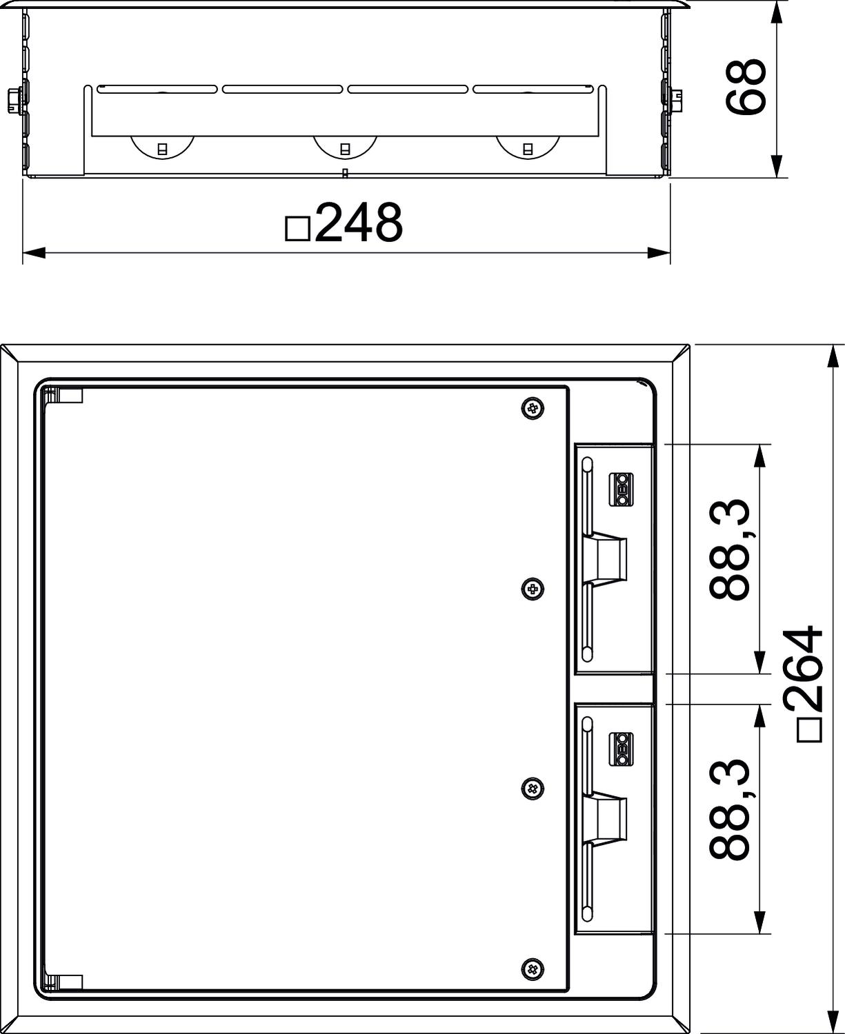 Cable outlet version Swivellable cord outlet CO2 Footprint (GWP) Cradle-to-Gate 11,6274 kg CO2e / 1 Piece Colour Iron grey; RAL 7011 Dimension 264x264x91 Floor care Dry Floor covering thickness 10 mm Frame version Carpet protection frame Heavy-duty version no Height-adjustment range, max. 85 mm Height-adjustment range, min. 65 mm Length 264 mm Material Polyamide Nominal size for device installation units 9 Number of installable devices 6 Opening mechanism Handle Protection rating (IP) when unused IP40 Protection rating (IP) when used IP20 Protection rating IK code IK08 Screed height, max. 85 mm Screed height, min. 65 mm Seal installation option no Suitable for cavity floor installation no Suitable for raised floor installation no Suitable for screed-covered underfloor ducts no Suitable for screed-flush closed underfloor ducts no Suitable for underfloor ducts no Vertical load, large area to 3,000 N Vertical load, small area to 2,000 N Width 264 mm - All types