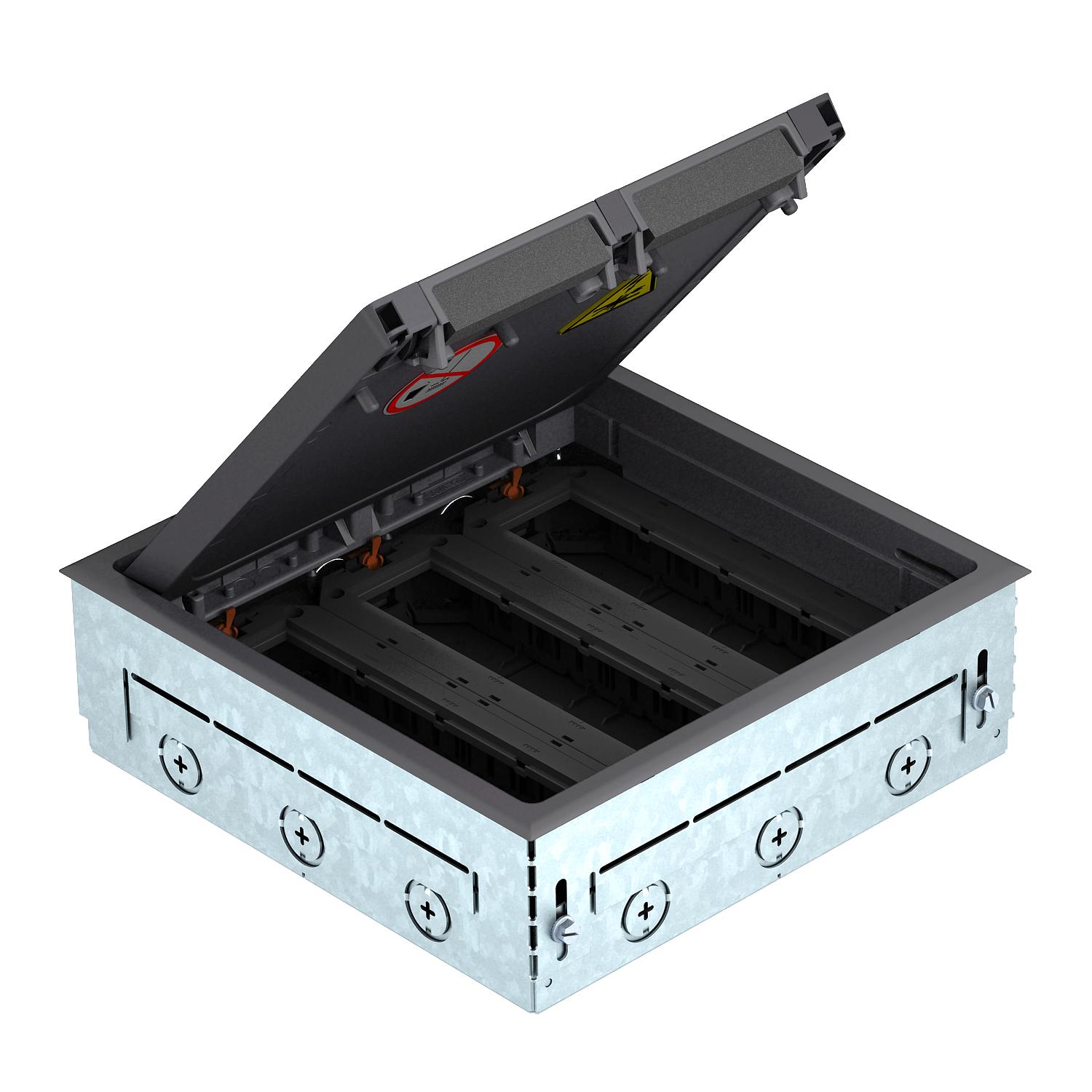 Cable outlet version Swivellable cord outlet CO2 Footprint (GWP) Cradle-to-Gate 14,2309 kg CO2e / 1 Piece Colour Iron grey; RAL 7011 Device support to accept mounting boxes yes Dimension 264x264x135 Floor care Dry Floor covering protection frame yes Floor covering thickness 10 mm Frame version Carpet protection frame Heavy-duty version yes Height-adjustment range, max. 93 mm Height-adjustment range, min. 83 mm Installation depth 83 mm Installation system type MT4 Length 264 mm Length of external dimensions 264 mm Material Polyamide Nominal size for device installation units 9 Number of installable devices 12 Number of mounting boxes 3 Opening mechanism Handle Protection rating (IP) when unused IP40 Protection rating (IP) when used IP20 Protection rating IK code IK08 Seal installation option no Suitable for cavity floor installation no Suitable for raised floor installation no Suitable for screed-covered underfloor ducts no Suitable for screed-flush closed underfloor ducts no Suitable for underfloor ducts no Suitable for wet care no Wide external dimensions 264 mm Width 264 mm With floor covering recess yes - All types