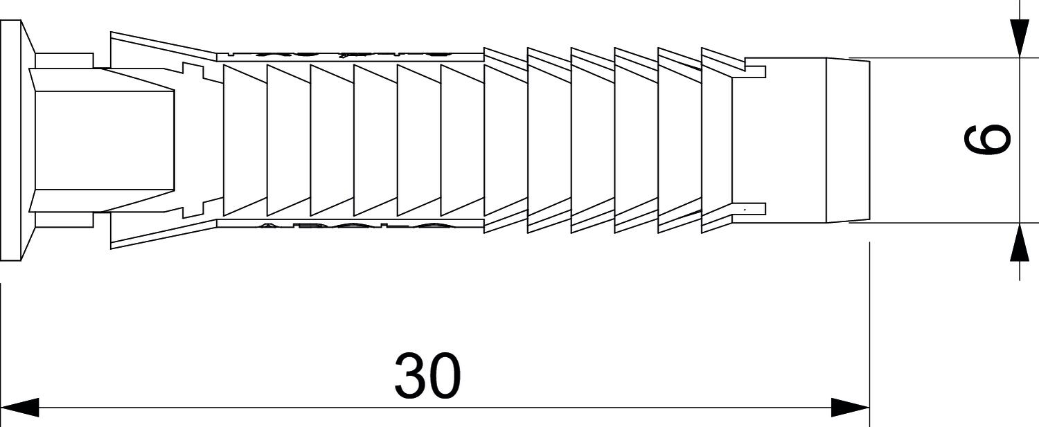 Colour Light grey Diameter 6 mm Dimension 6x30 Dimension D 6 mm Dimension L 30 mm Drill hole diameter, min. 6 mm Length 30 mm Material Polyethylene Pull-out value 470 N Suitable for fastening with cable ties no Suitable for hexagonal wood screw yes Version for Universal anchor With bolts no Wood screws 3,5-5 - All types