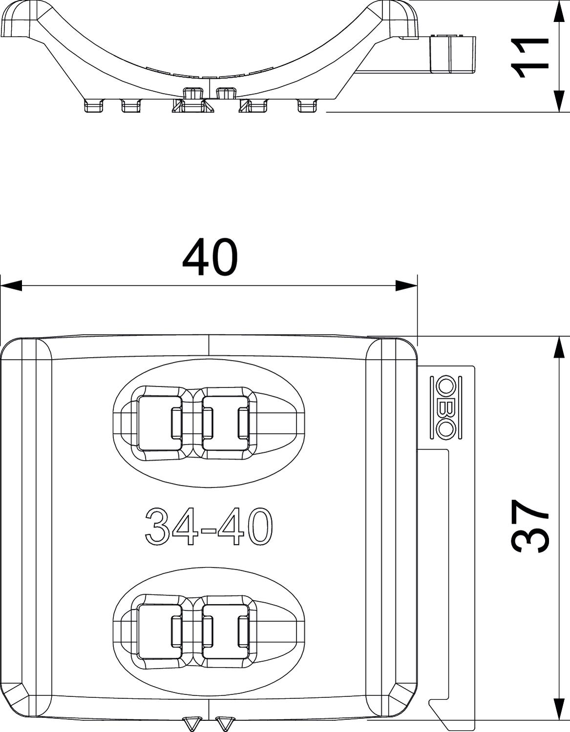 Clamping range D, max. 40 mm Clamping range D, min. 34 mm CO2 Footprint (GWP) Cradle-to-Gate 0,0198 kg CO2e / 1 Piece Colour Light grey; RAL 7035 Counter-trough/clip version Counter sleeve Dimension 34-40mm Dimension B 45,5 mm Dimension H 10,8 mm Dimension L 37 mm Material Polypropylene Suitable for max. cable diameter 40 mm - All types