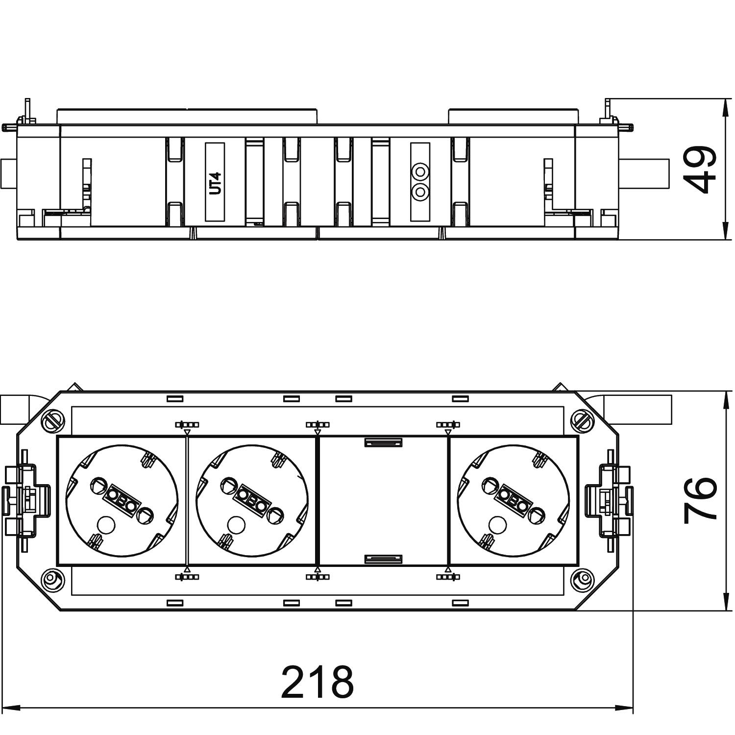 Product descriptionThe ready-for-connection UTC4 universal support has 2 pre-installed 33° protective contact sockets in orange and one pre-installed 33° protective contact socket in mint green and one blanking cover for retroinstallation of an installation device of the Modul 45 or Modul 45connect series, 250 V~, 16 A.