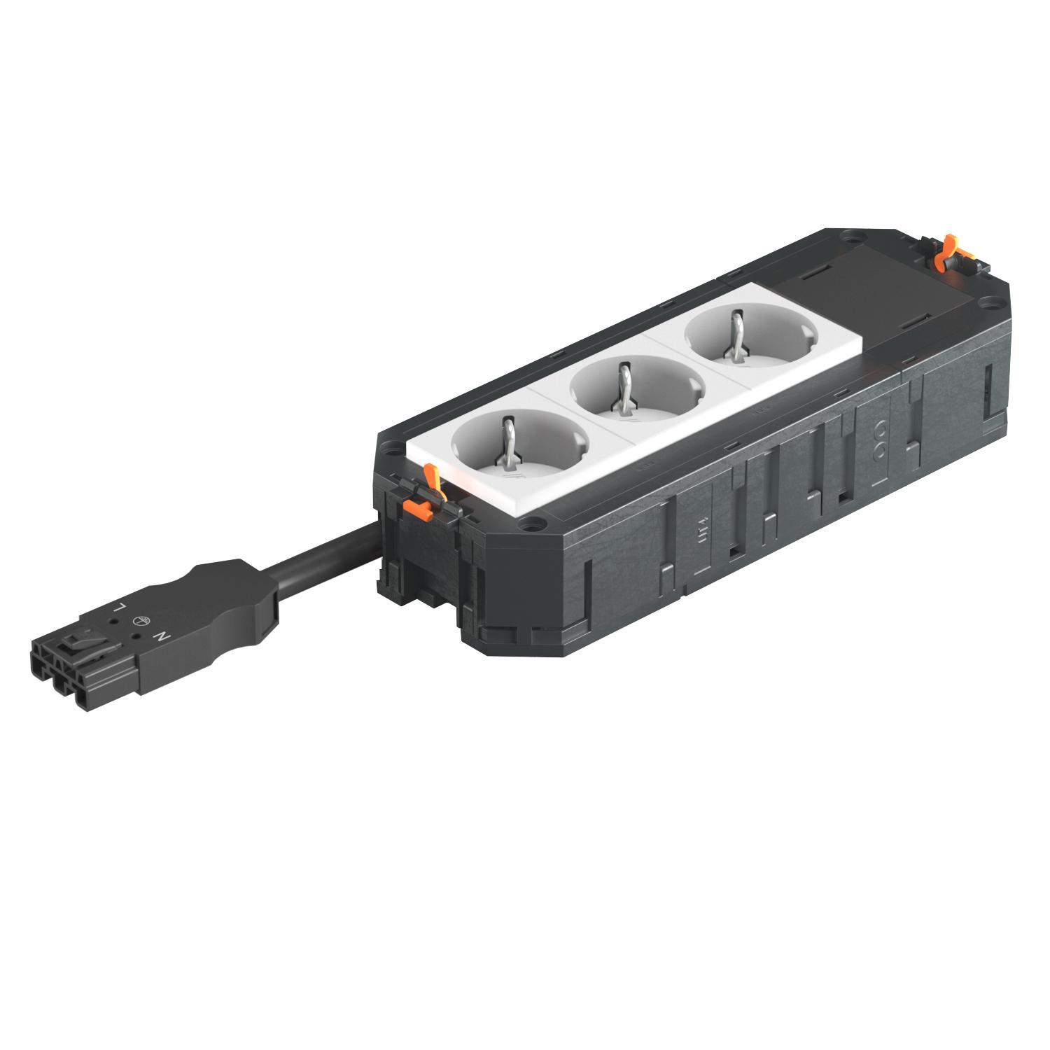 The ready-for-connection UTC4 universal support has 3 pre-installed 33° protective contact sockets in white and one blanking cover for retroinstallation of an installation device of the Modul 45 series.