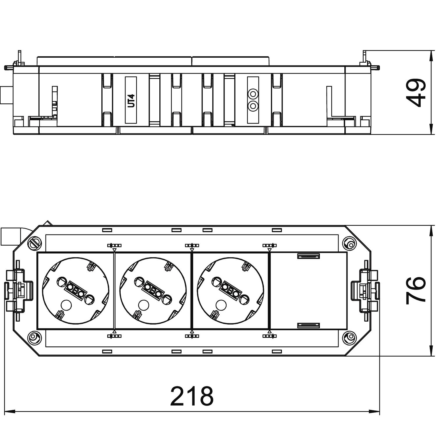 Product descriptionThe ready-for-connection UTC4 universal support has 3 pre-installed 33° protective contact sockets in white and one blanking cover for retroinstallation of an installation device of the Modul 45 series.