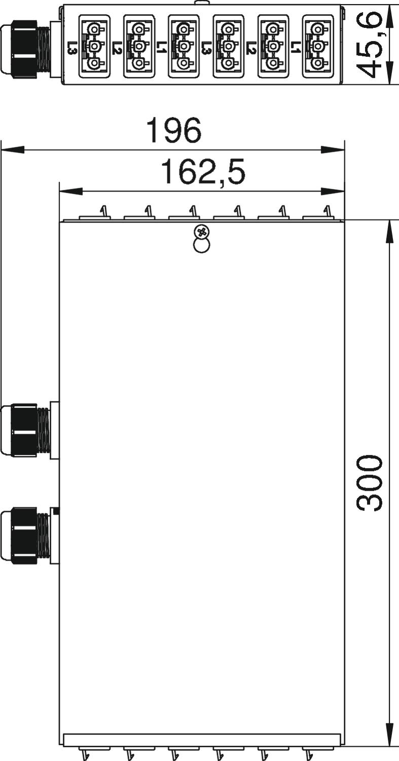 Output: Twelve self-locking connectors, 3-pin, in white (6x) and black (6x), 16 A, type GST18i (socket part: 2 x L1, 2 x L2, 2 x L3 for each rotary current circuit).