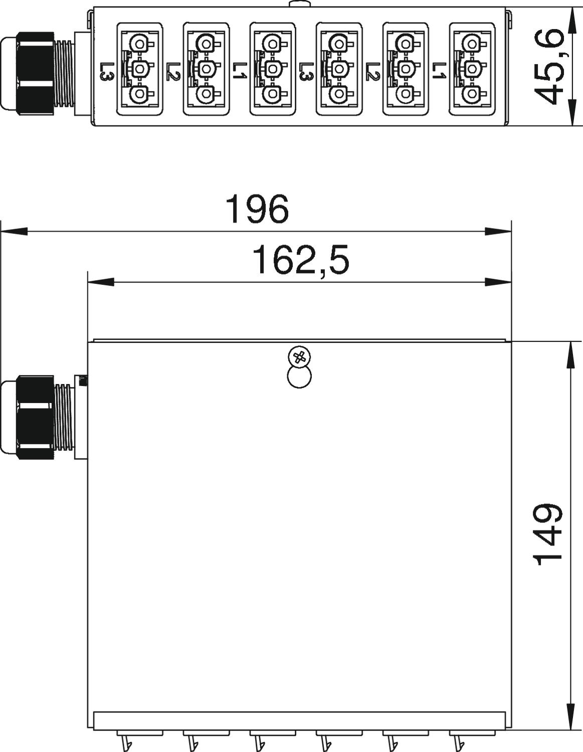 Output: six self-locking connectors, 3-pin, in white, 16 A, type GST18i (socket: 2 x L1, 2 x L2, 2 x L3). Internal wiring: PVC non-sheathed cable H07V-U2.5.