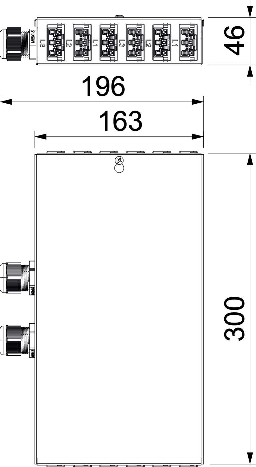 CO2 Footprint (GWP) Cradle-to-Gate 4,134 kg CO2e / 1 Piece Colour of the plug connector system Black/white Connection type Terminal block Cross-section of the connection cable 4 mm² Dimension 300x196x46 Height 46 mm Input 5-pole Length 300 mm Material Steel No. of outlets 12 Number of input circuits 2 Plug connector system, system-specific yes Width 163 mm - All types