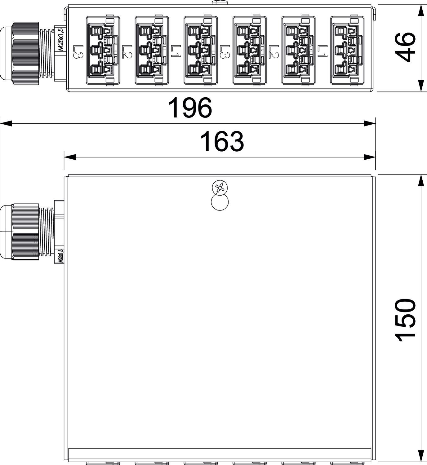 CO2 Footprint (GWP) Cradle-to-Gate 2,2897 kg CO2e / 1 Piece Colour of the plug connector system White Connection type Terminal block Cross-section of the connection cable 4 mm² Dimension 150x196x46 Height 46 mm Input 5-pole Length 196 mm Material Steel No. of outlets 6 Number of input circuits 1 Plug connector system, system-specific yes Width 149 mm - All types