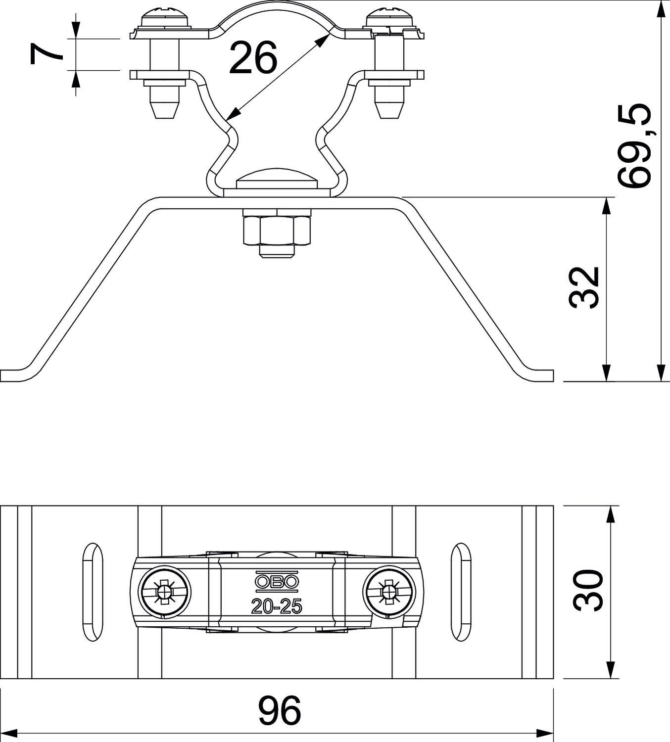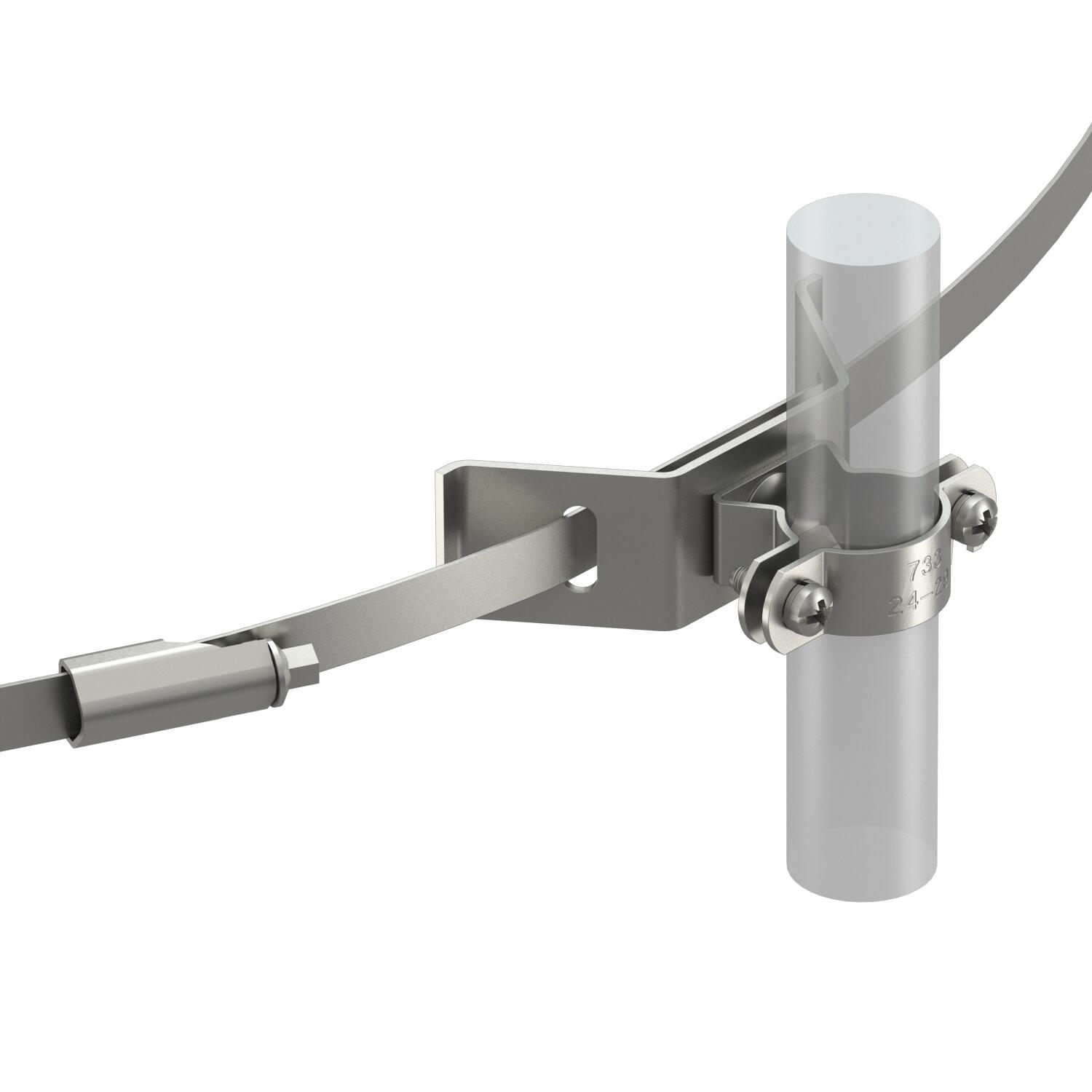 Product descriptionCable bracket with tightening strap for isCon® conductor, for mounting on pipes with Ø ≤ 600 mm. Including sprung discs to protect the screws against loosening.