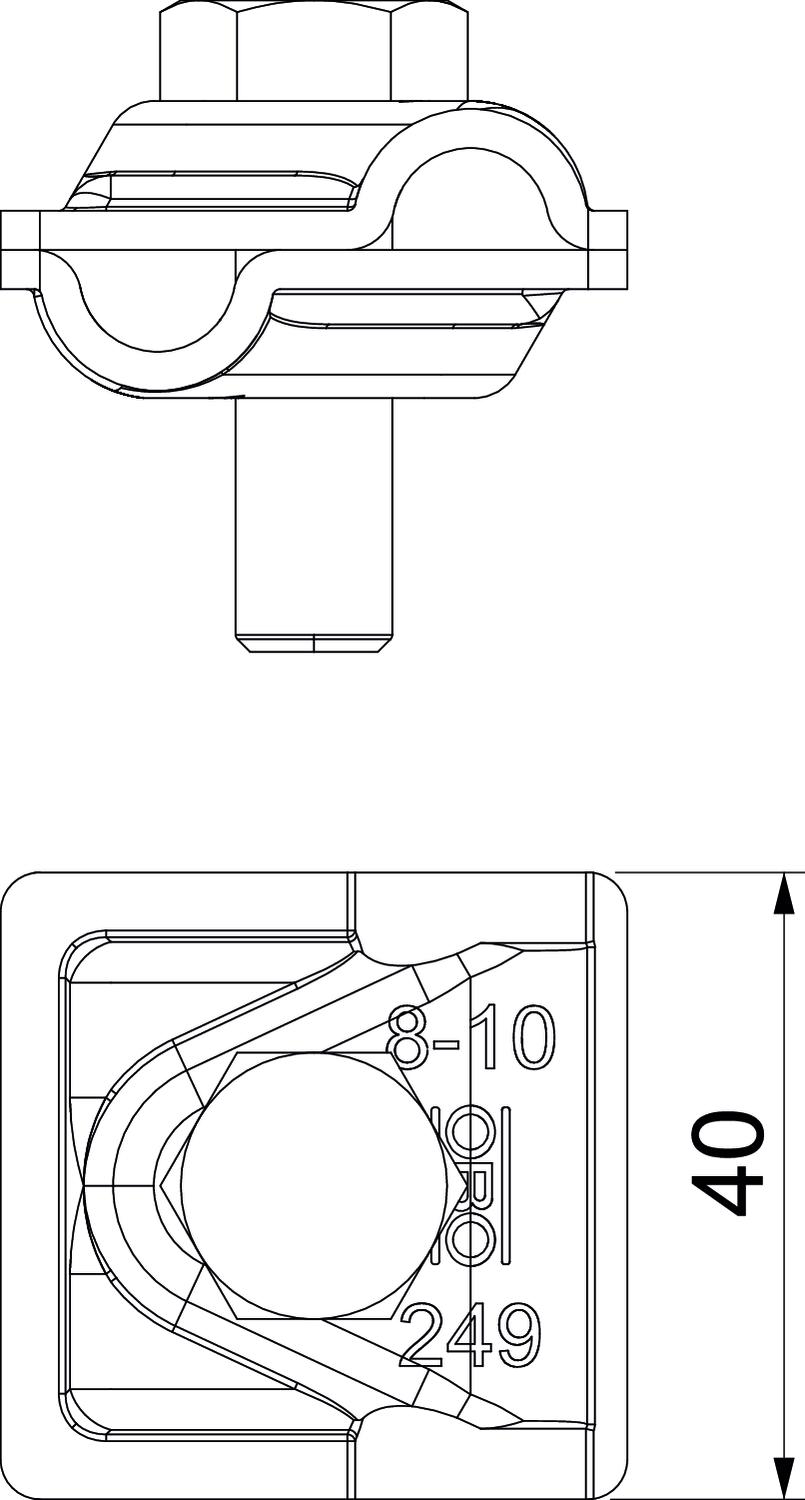CO2 Footprint (GWP) Cradle-to-Gate 0,6844 kg CO2e / 1 Piece Connection Round conductor Dimension 40x40mm Dimension A 40 mm Fit Rd 8-10 mm Intermediate plate no Length 40 mm Lightning current carrying capacity H/100 kA Material Stainless steel 1.4571/1.4404 Round conductor diameter, conductor 1, max. 10 mm Round conductor diameter, conductor 1, min. 8 mm Round conductor diameter, conductor 2, max. 10 mm Round conductor diameter, conductor 2, min. 8 mm Short-circuit current (50 HZ)(1 s;≤300°C) 1,4 kA Suitable for connection Round conductor Rd 8–10 / Rd 8–10 TBS application Connection system Type of connector Multipurpose connection clamp Type of fastening screw Hexagonal bolt - All types