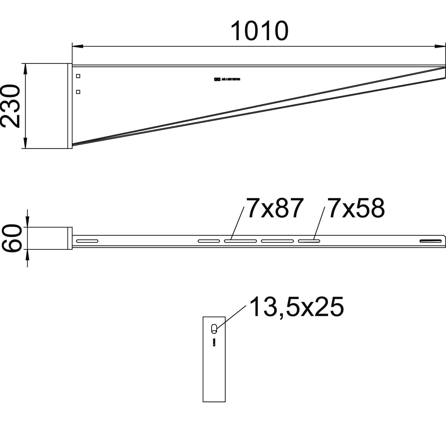 Angle range, max. 90 mm Angle range, min. 90 mm CO2 Footprint (GWP) Cradle-to-Gate 20,687 kg CO2e / 1 Piece Colour zinc Dimension B1010mm Dimension A 60 mm Dimension B 1010 mm Dimension H 230 mm F in kN 5,5 kN Height 230 mm Hole diameter 13,5 mm Length 60 mm Maintain electrical functions no Material Steel Rustproof steel, pickled no Surface Hot-dip galvanised Version for Wall and support bracket Width 1010 mm Technical data