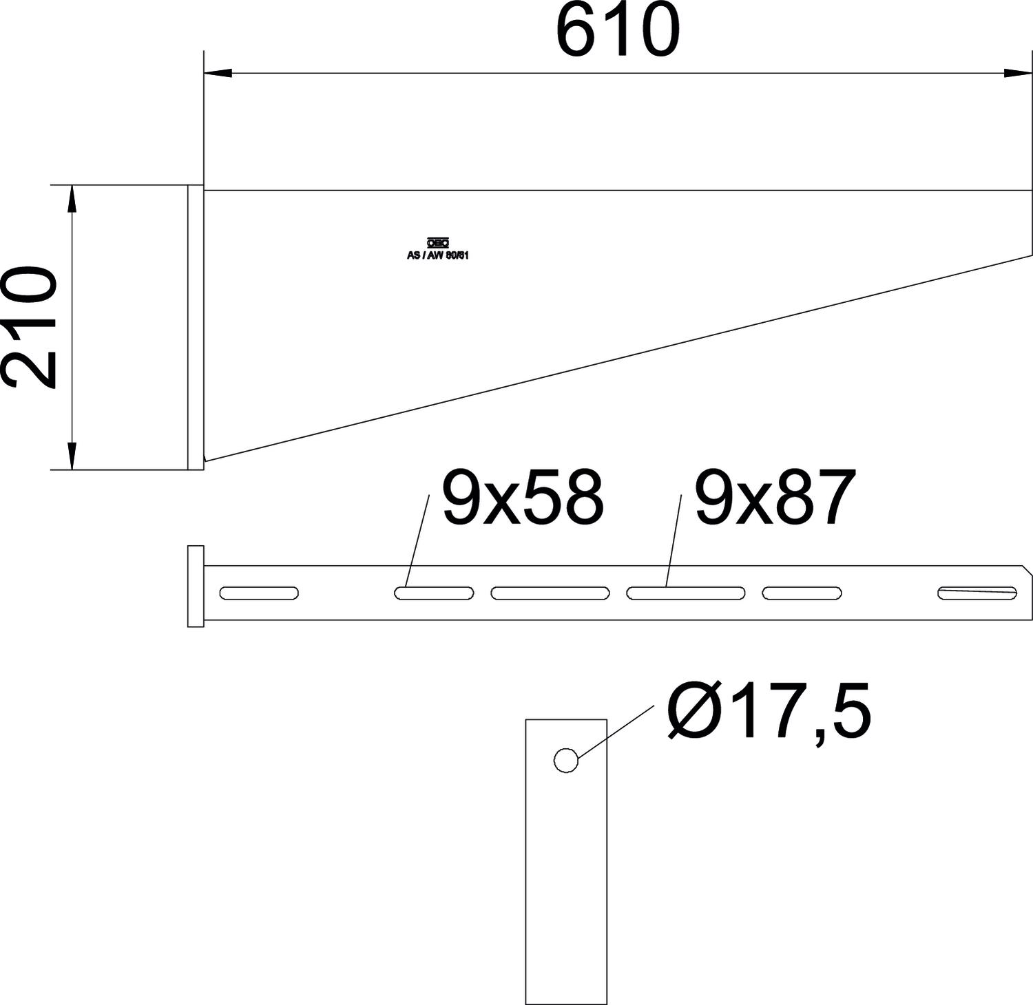 Angle range, max. 90 mm Angle range, min. 90 mm CO2 Footprint (GWP) Cradle-to-Gate 11,7008 kg CO2e / 1 Piece Colour zinc Dimension B610mm Dimension A 60 mm Dimension B 610 mm Dimension H 210 mm F in kN 8 kN Height 210 mm Hole diameter 17,5 mm Length 60 mm Maintain electrical functions no Material Steel Rustproof steel, pickled no Surface Hot-dip galvanised Version for Wall and support bracket Width 610 mm Technical data