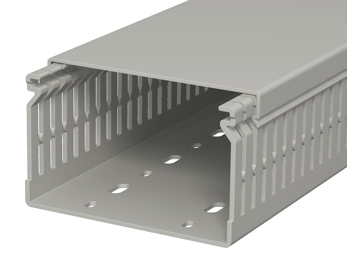 Product descriptionWiring duct, incl. cover and base perforation, for horizontal and vertical routing of electrical cables in the switchgear cabinet. Designed as a metric duct. The nominal dimension of the system size corresponds to the internal dimension of the duct. Retainers are broken out without tools. The flush-floor routing of cables is possible through predetermined break points. Tapering in the side slots prevents the cables from falling out. Tested to DIN EN 50085-2-3. Special lengths on request.