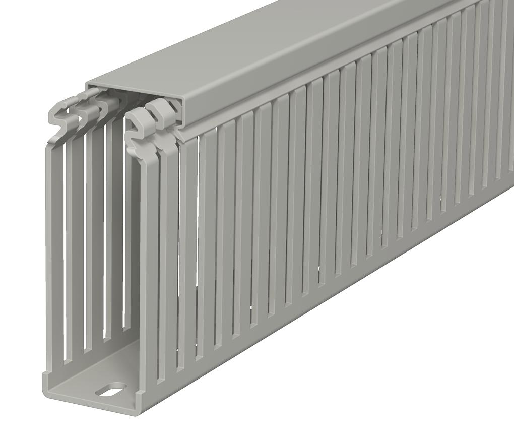 Product descriptionWiring duct according to DIN EN 50085-2-3, incl. cover and base perforation, for horizontal and vertical routing of electrical cables in the switchgear cabinet. Designed as a DIN duct. Retainers are broken out without tools. The flush-floor routing of cables is possible through predetermined break points. Tested to DIN EN 50085-2-3. Special lengths on request.