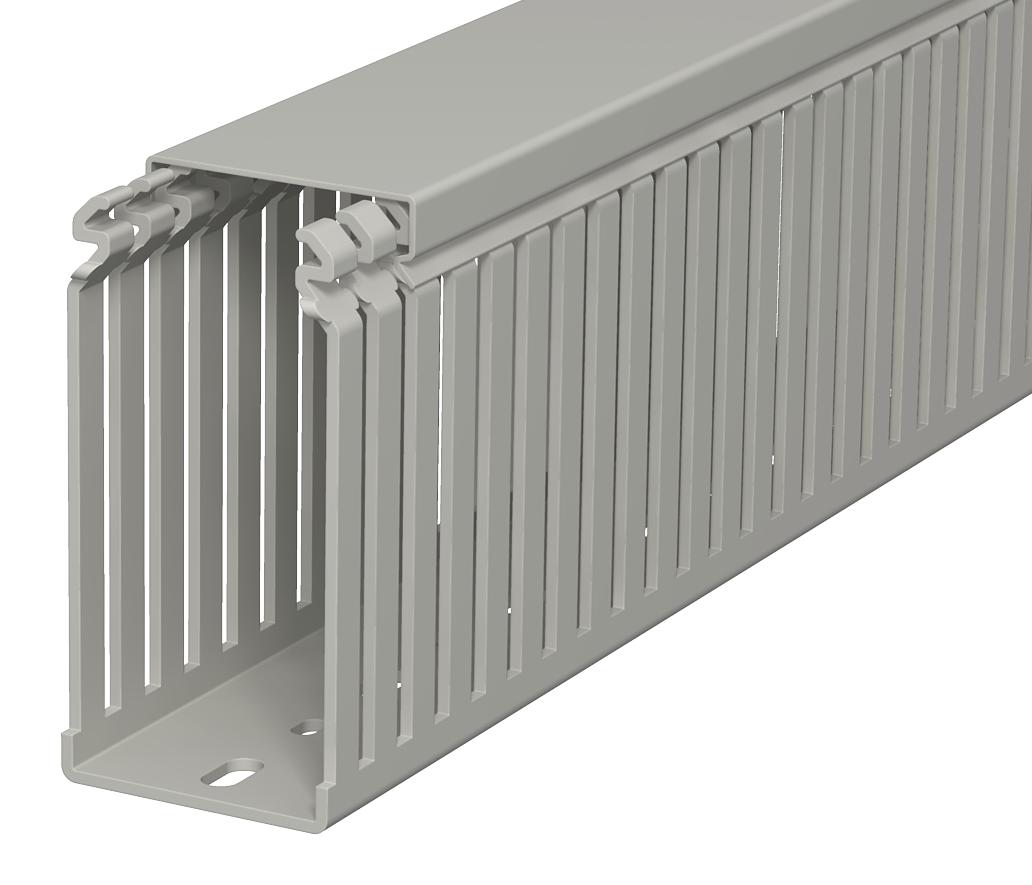 Product descriptionWiring duct according to DIN EN 50085-2-3, incl. cover and base perforation, for horizontal and vertical routing of electrical cables in the switchgear cabinet. Designed as a DIN duct. Retainers are broken out without tools. The flush-floor routing of cables is possible through predetermined break points. Tested to DIN EN 50085-2-3. Special lengths on request.