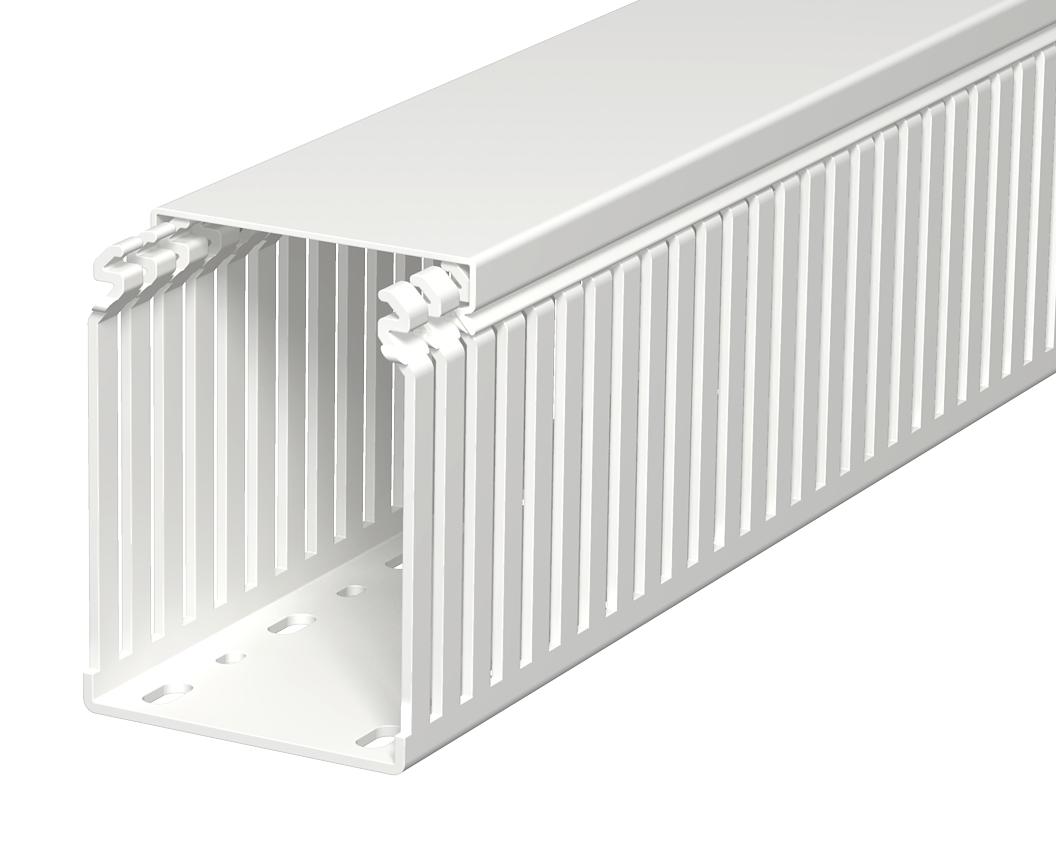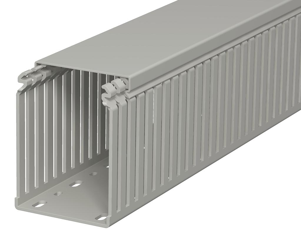 Product descriptionWiring duct according to DIN EN 50085-2-3, incl. cover and base perforation, for horizontal and vertical routing of electrical cables in the switchgear cabinet. Designed as a DIN duct. Retainers are broken out without tools. The flush-floor routing of cables is possible through predetermined break points. Tested to DIN EN 50085-2-3. Special lengths on request.